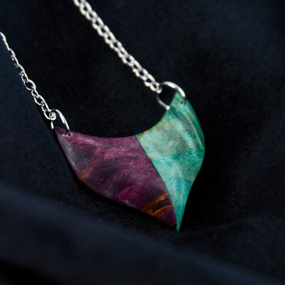 Pendentif de la collection bois éternel en essence de bouleau stabilisé de couleur violette et turquoise.