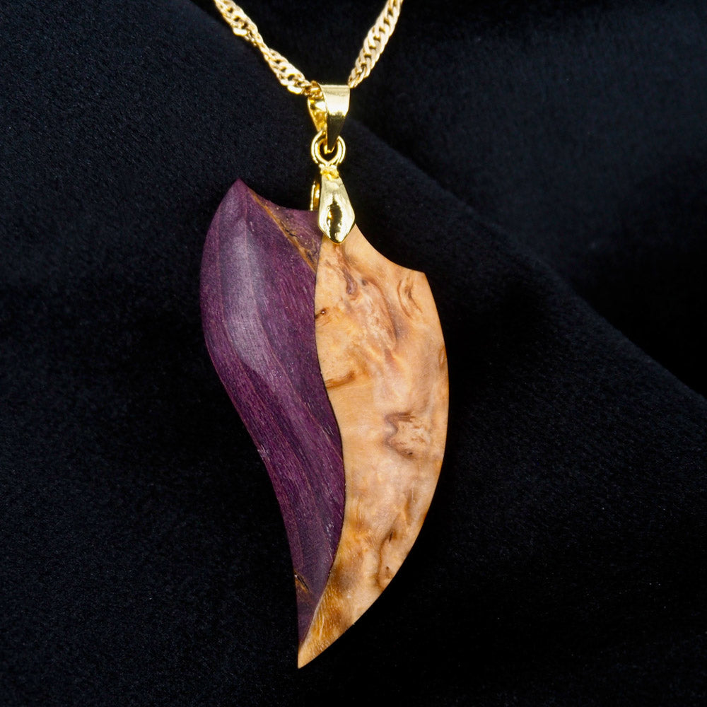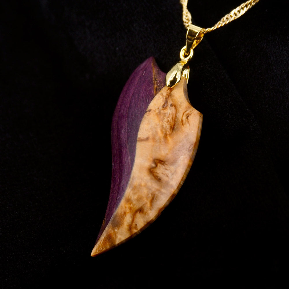 Pendentif de la collection bois éternel en essence de bouleau stabilisé de couleur violette et turquoise.