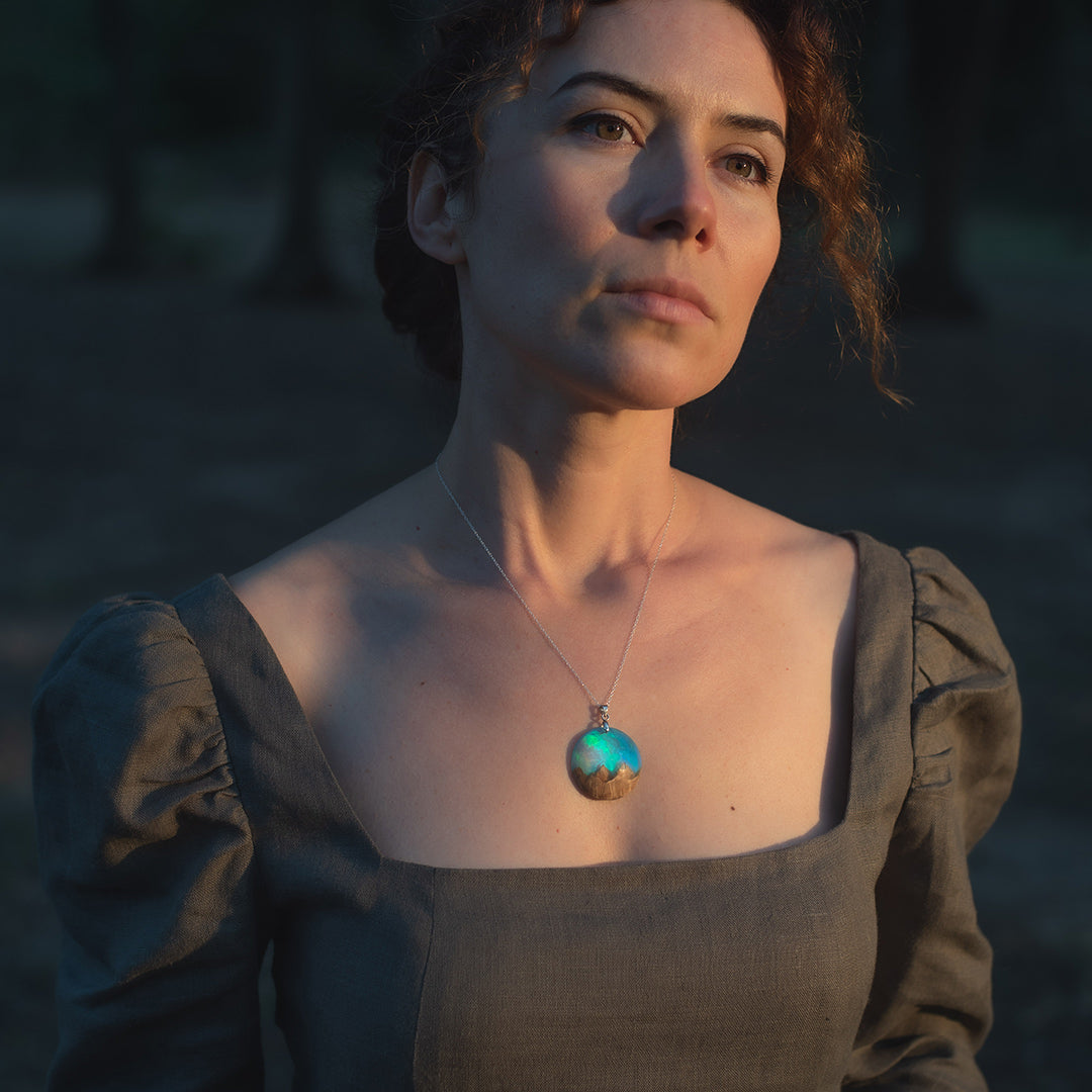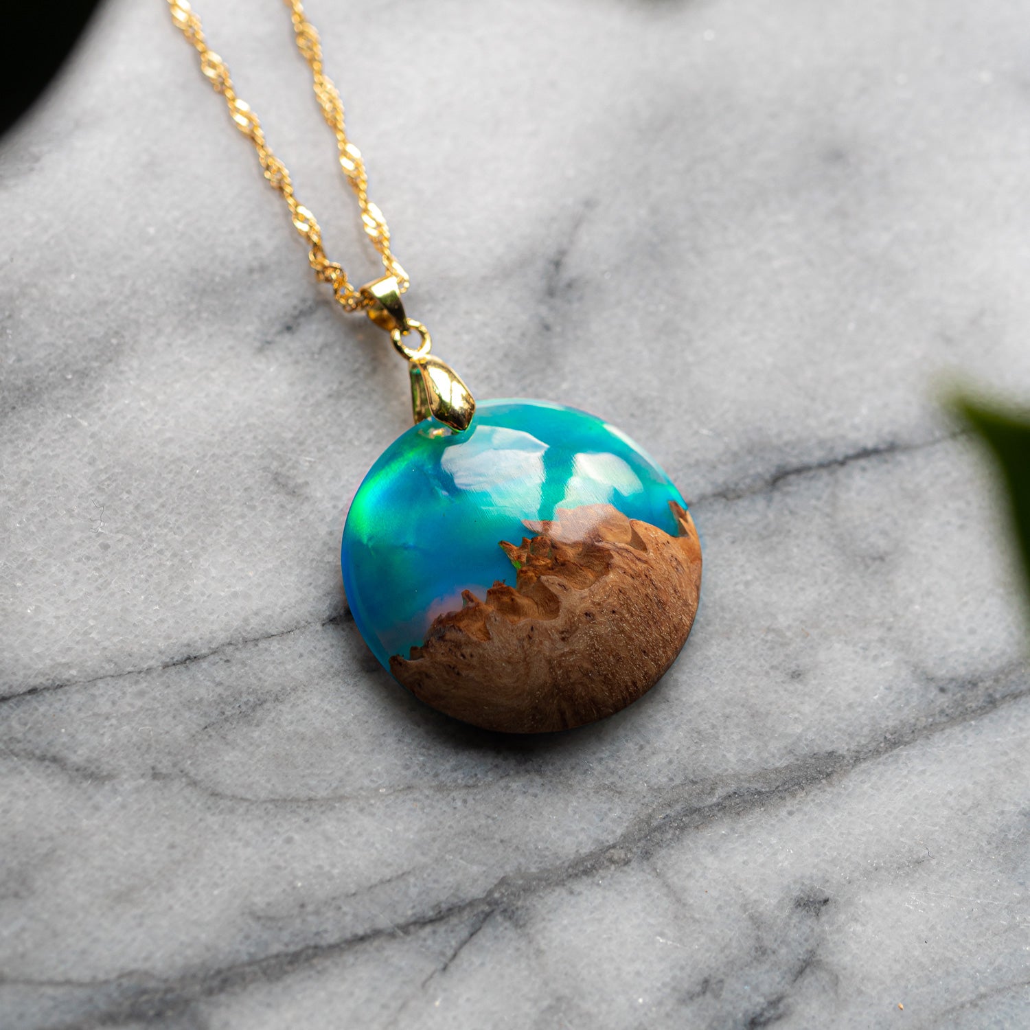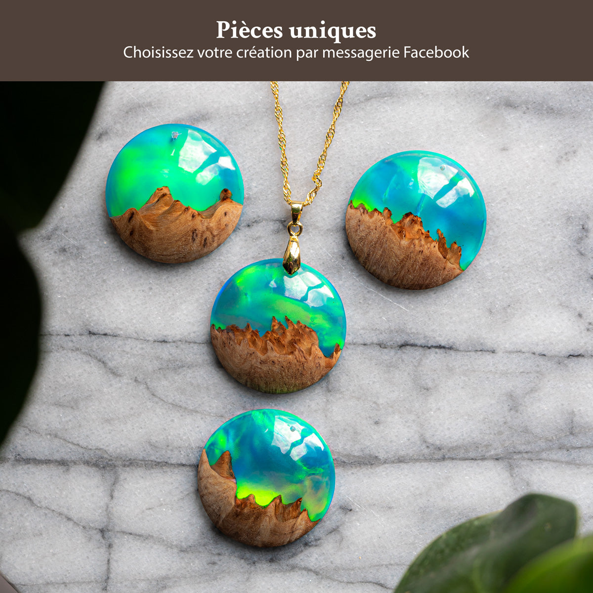 Découvrez un bijou unique alliant élégance et poésie, inspiré par les mystères célestes des aurores boréales. Ce pendentif rond, fabriqué à la main, marie la chaleur de la loupe d’eucalyptus à la transparence cristalline de la résine, mettant en valeur une opale de laboratoire aux reflets irisés et changeants. Chaque mouvement révèle une danse subtile de couleurs : des éclats de vert, de bleu et de violet qui évoquent les nuances captivantes des aurores polaires.