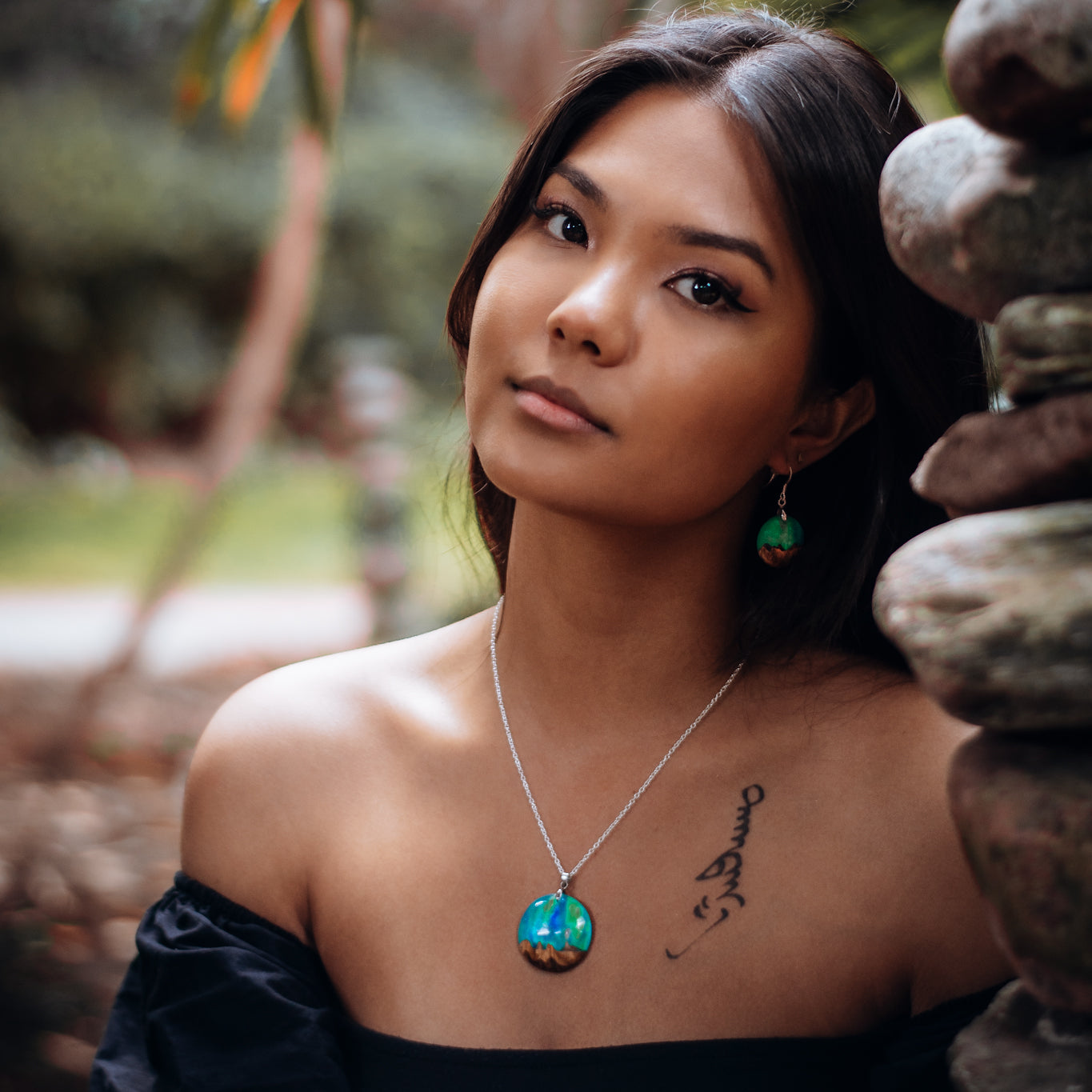 La loupe d’eucalyptus, avec ses motifs naturels et ses teintes boisées, apporte un contraste harmonieux avec l'opale et la résine, rendant chaque pendentif véritablement unique.