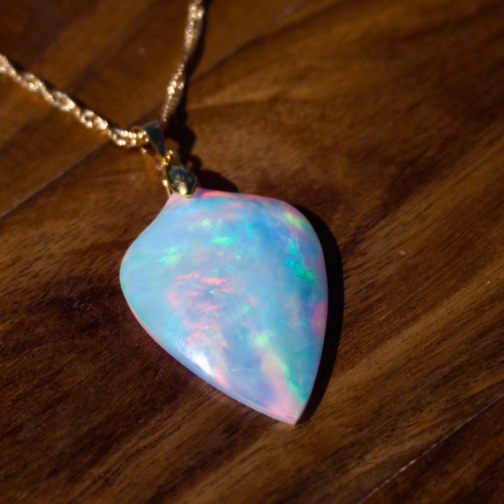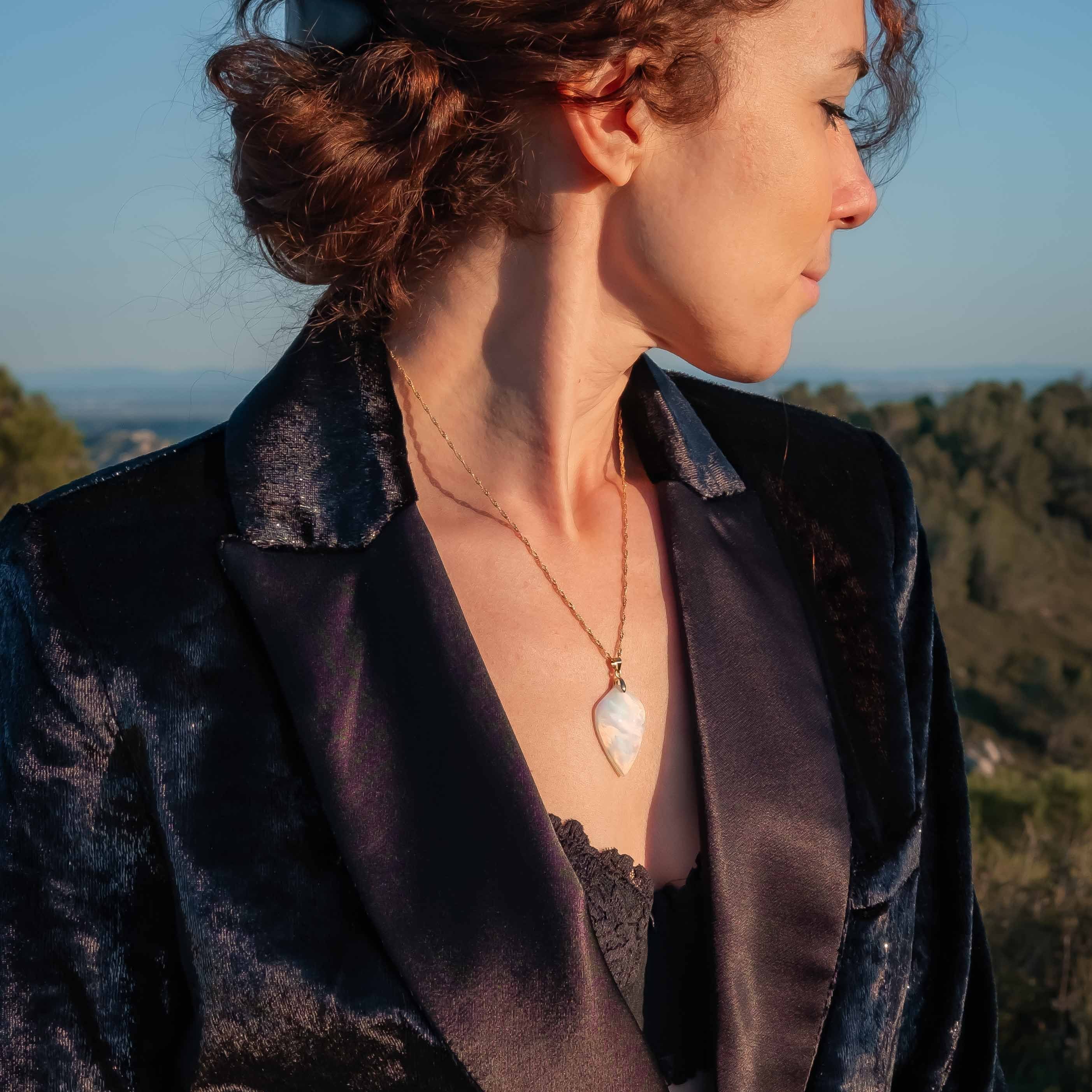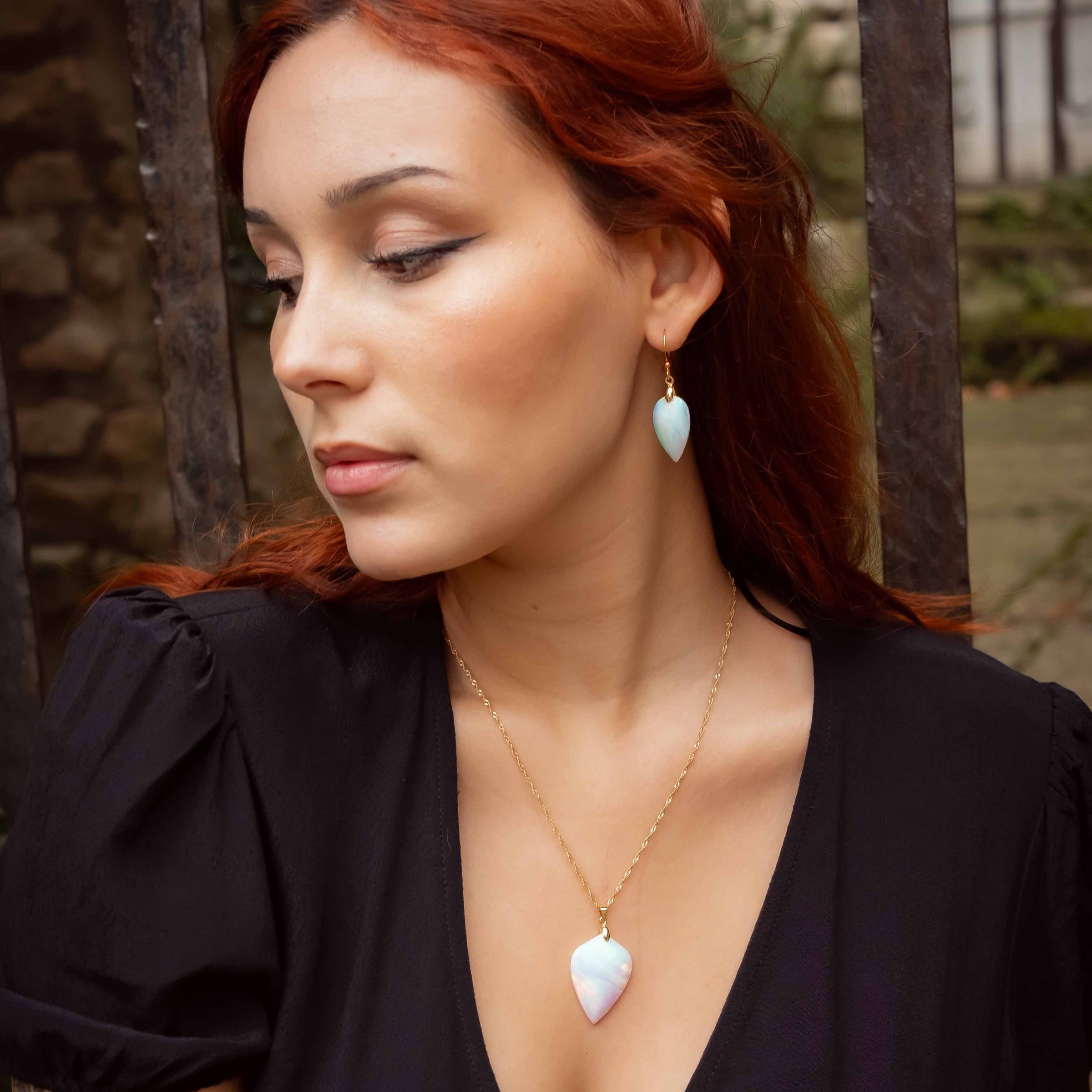 Ce pendentif unique, inspiré par Anahata, le chakra du cœur, est fait à la main en opale de laboratoire. Ses reflets irisés captent la lumière avec grâce, évoquant l'amour, l'équilibre et la sérénité, des qualités associées au chakra du cœur. L'opale scintillante symbolise l'harmonie intérieure,