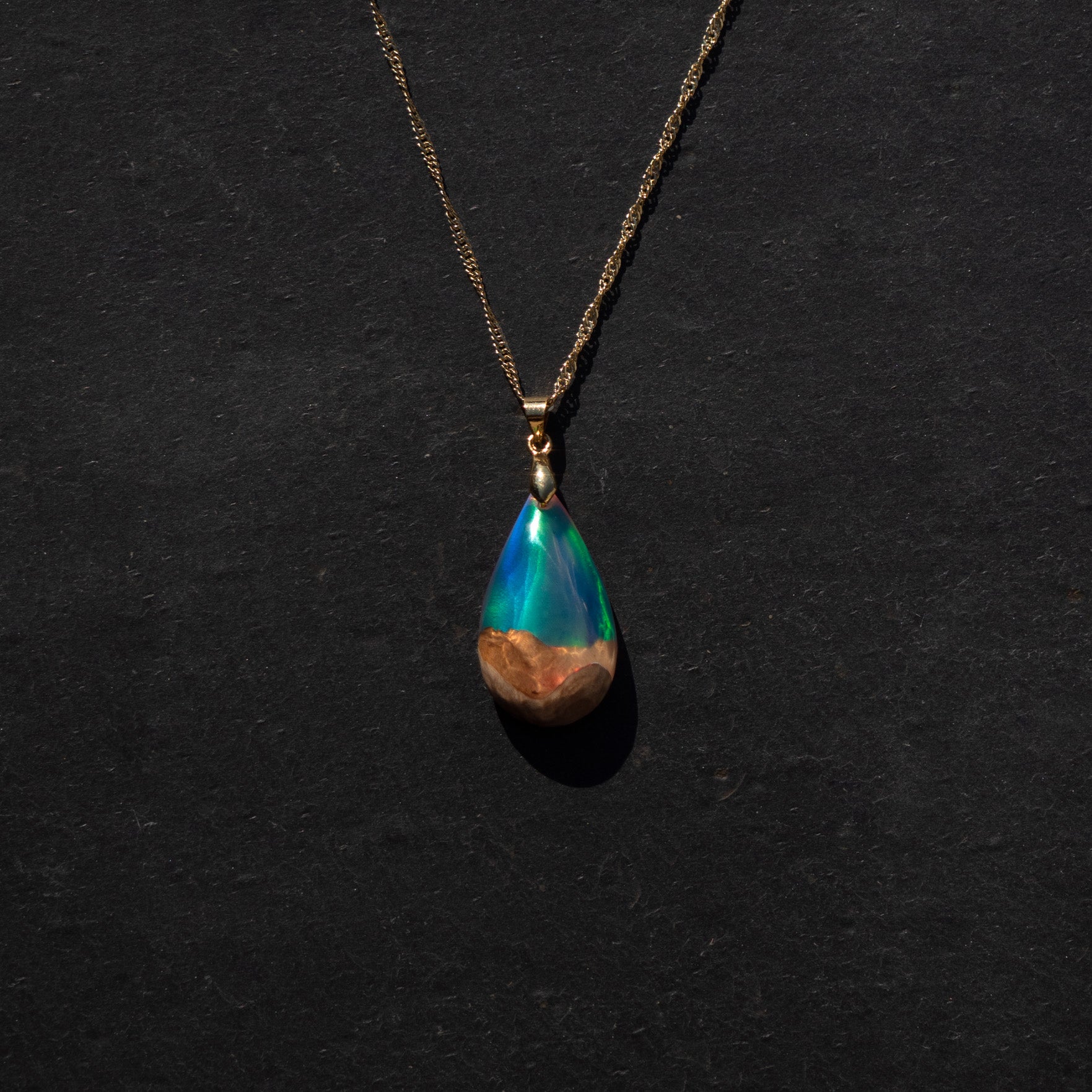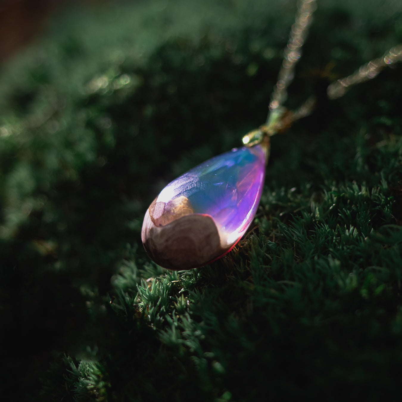 La loupe d’eucalyptus, avec ses motifs naturels et ses teintes boisées, apporte un contraste harmonieux avec l'opale et la résine, rendant chaque pendentif véritablement unique.