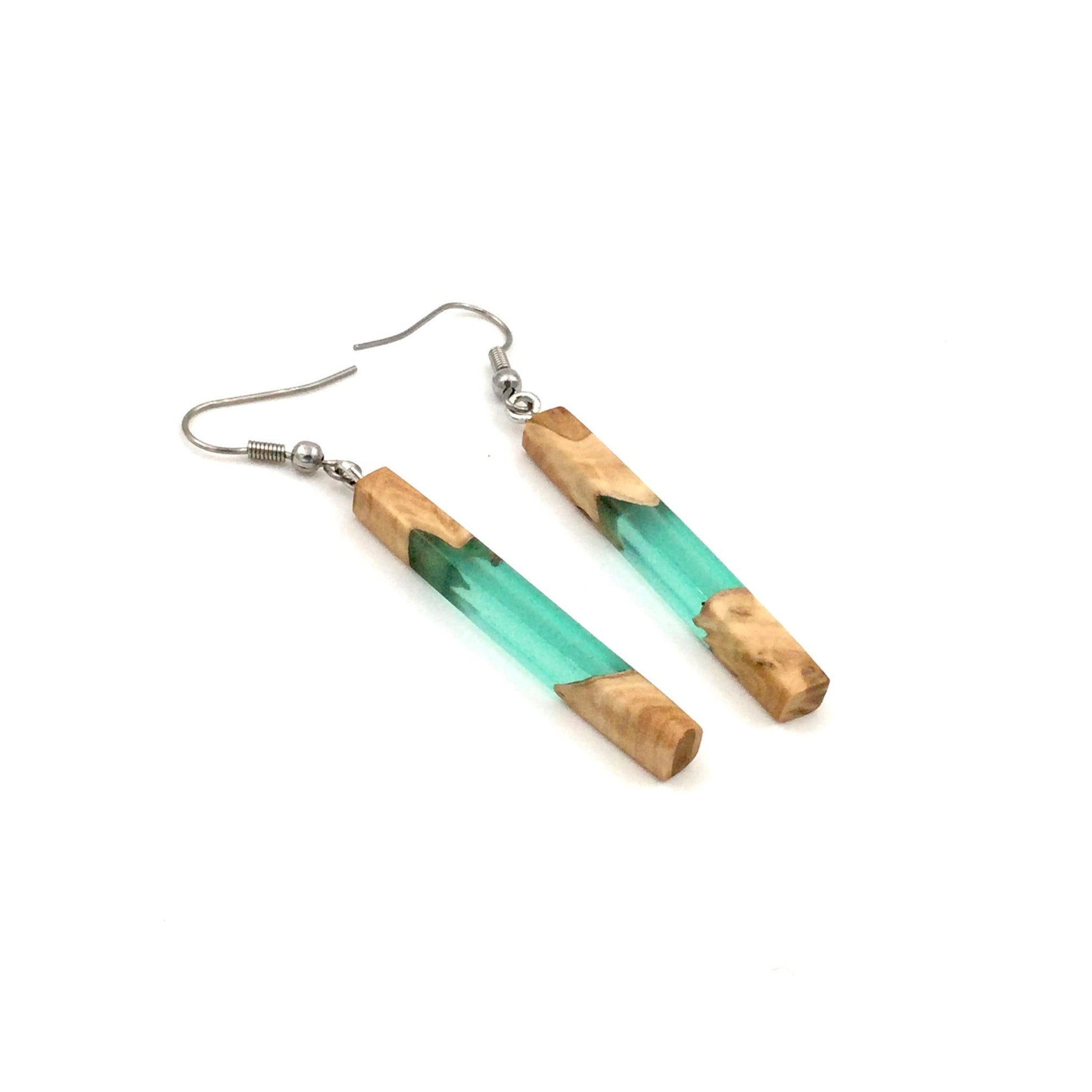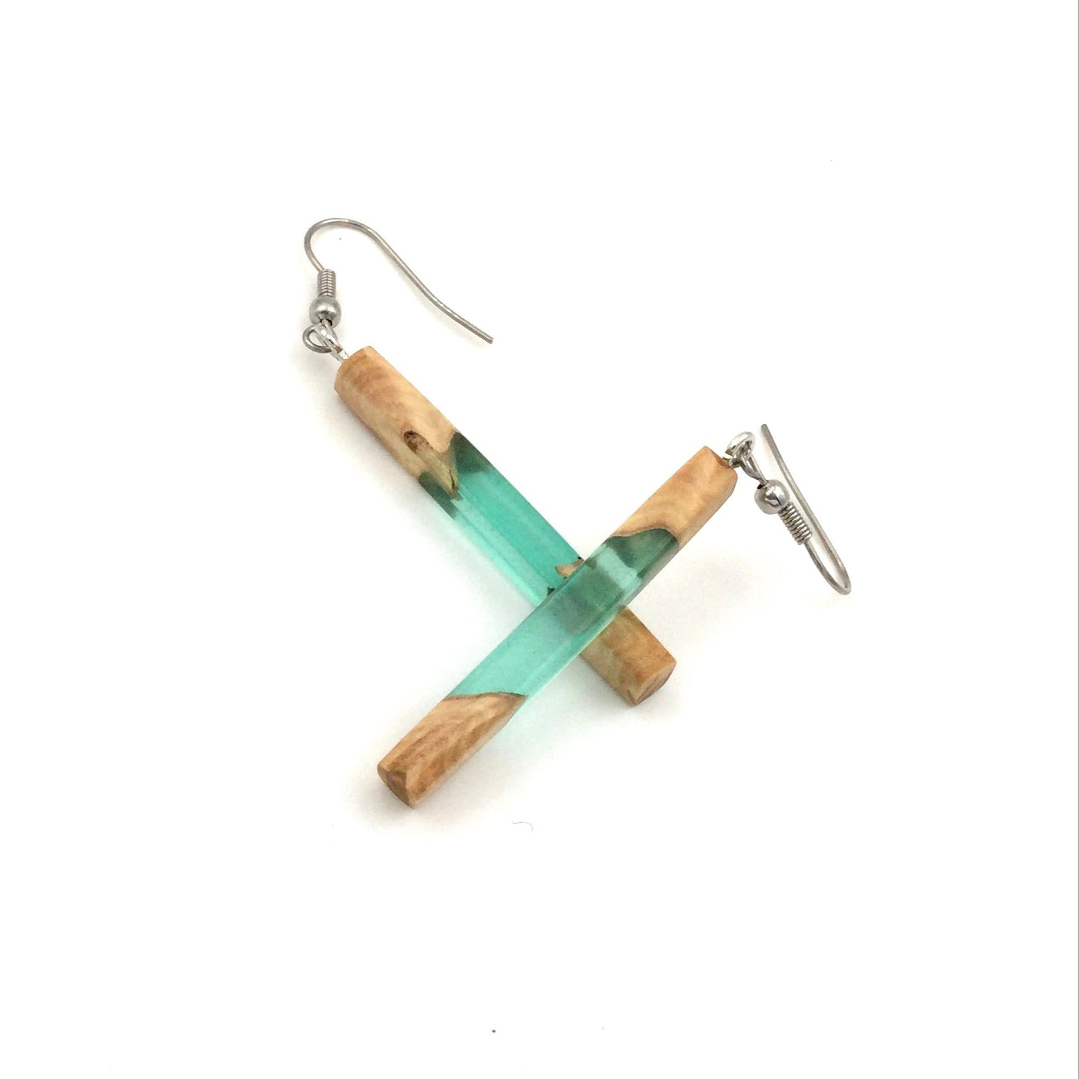Pièce unique #024 - Boucles d'oreilles en Bois d'eucalyptus et Résine verte émeraude