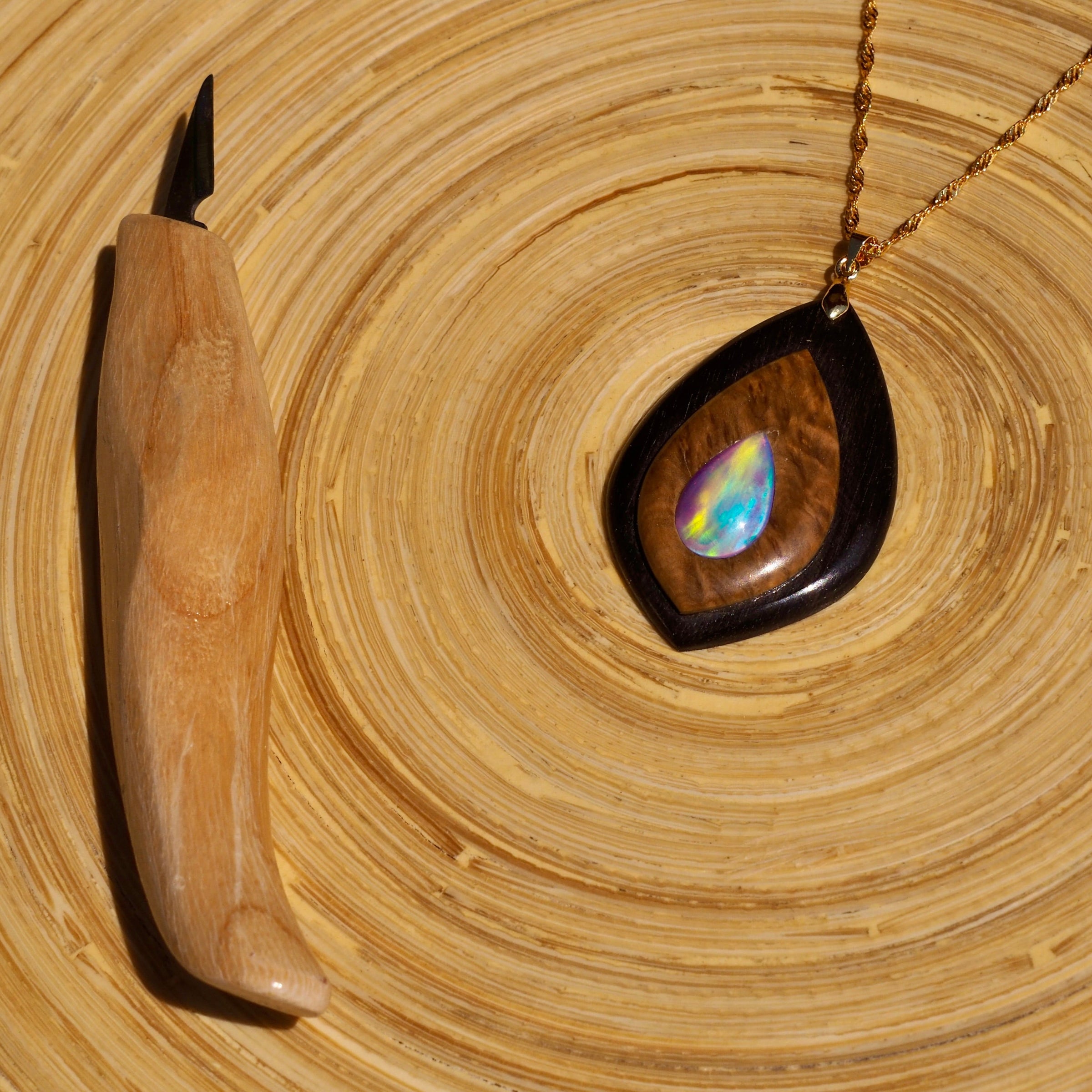 Pièce unique #46 - Pendentif en Ebene, Eucalyptus et Opale