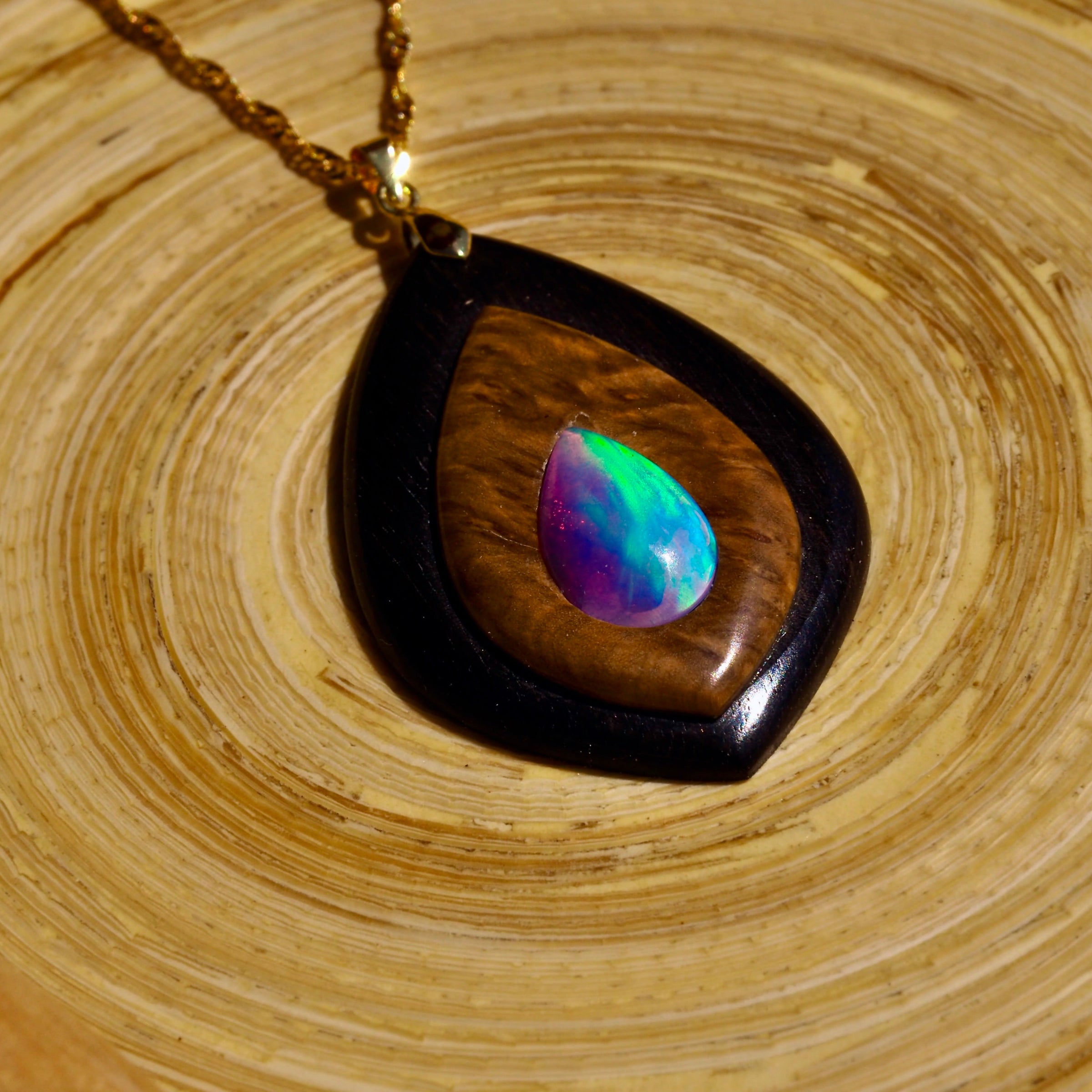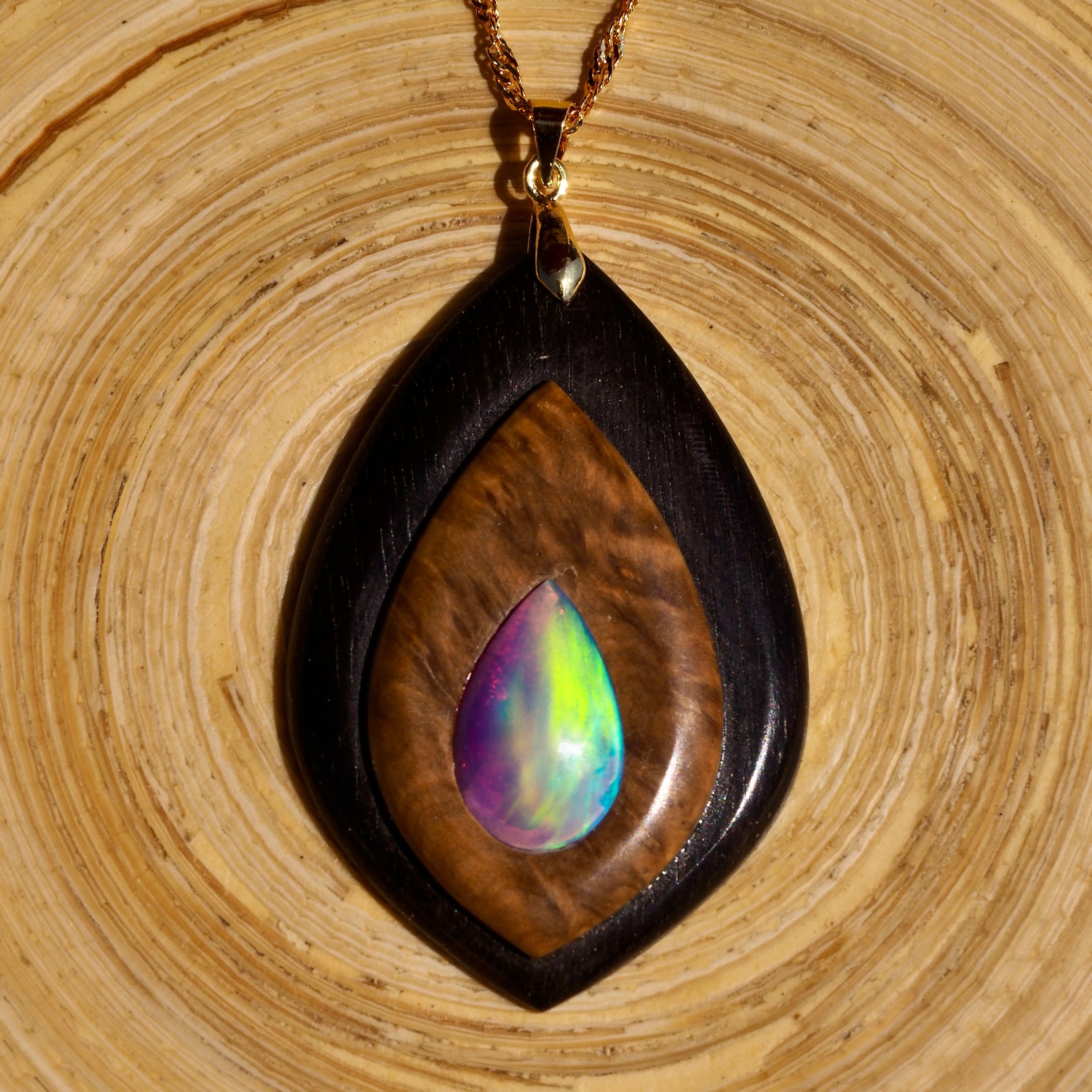 Pendentif en Bois d'Ebene, Eucalyptus et Opale